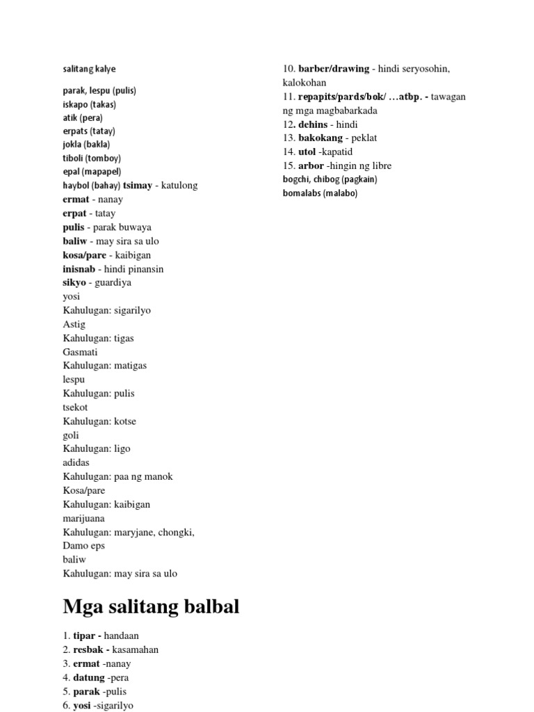 Pwede rin itong tawaging salitang kanto. Mga Halimbawa Ng Balbal Na Salita. Erpat Ama Father.