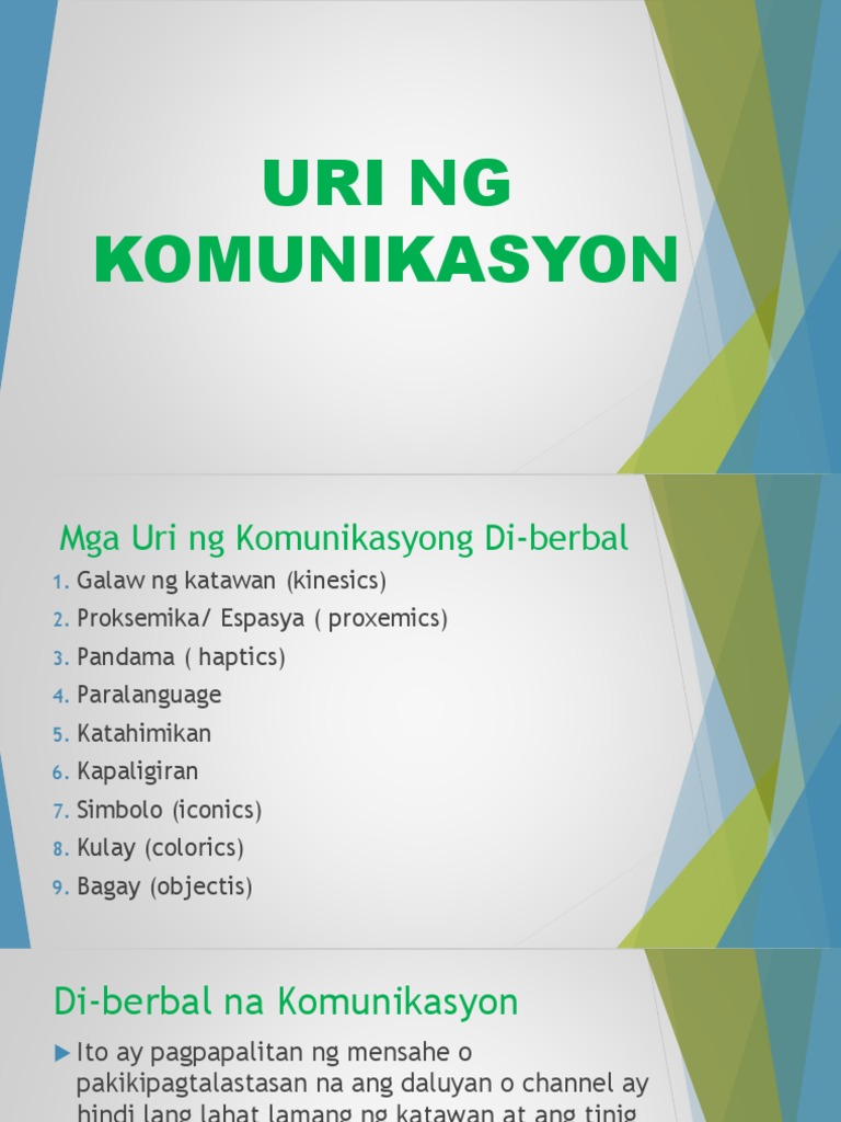 Olpatoriks Olphatorics Tinutukoy nito ang tono ng tinig pagtaas at pagbaba pagbigkas ng mga salita o bilis ng pagsasalita Binibigyang-kahulugan ang amoy bilang isa sa mga di-berbal na mensahe Maaaring nakapagpapaala. Ang mode ng komunikasyon na ito ay sumasaklaw sa isang malaking bilang ng mga kilos postura tunog at pag-uugali na nagbibigay sa amin ng lahat ng mga uri ng mga mensahe. Mayroon tayong tinatawag na berbal at di berbal.