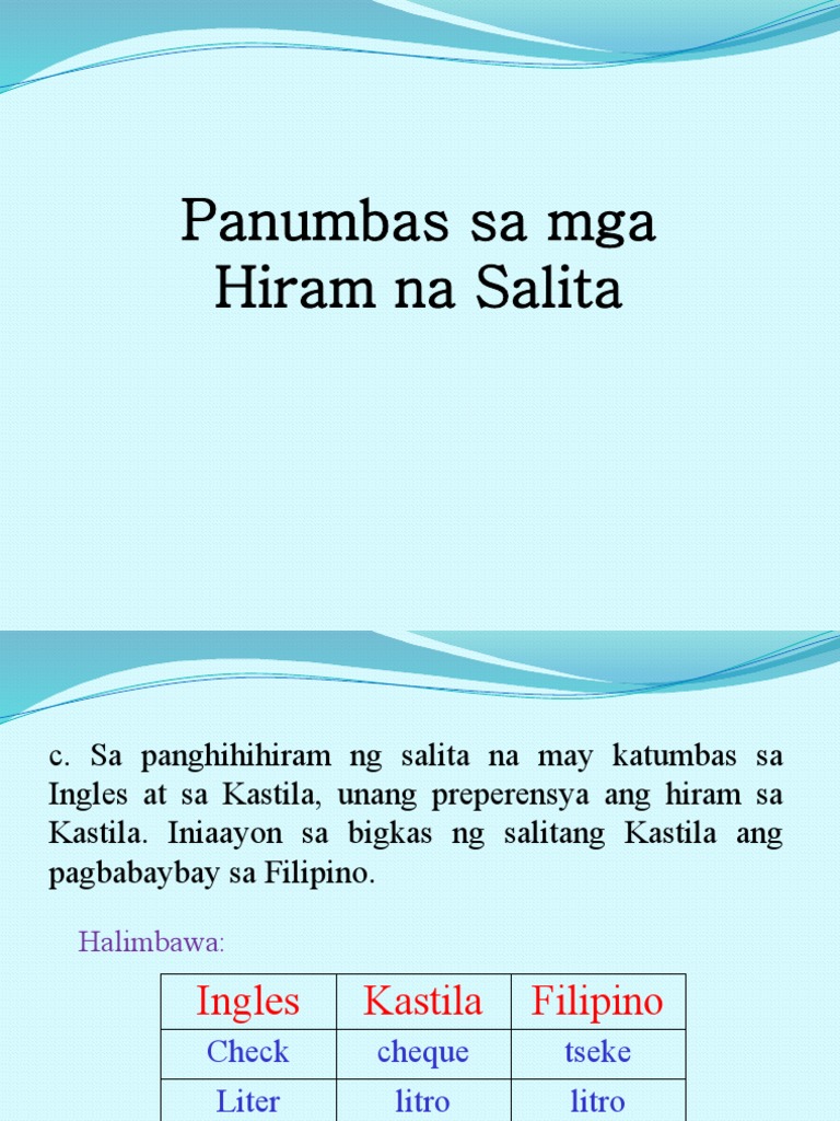 Tingnan mo akoy maghihintay sa mga tawiran sa ilang hanggang sa may dumating na salita na mula sa inyo na magpatotoo sa akin. Ballena kalye mula sa Kast. Tatlong libong salitang malayIsang libo sa ingles at daan-daang mga salita rin ang hiniram natin saInstikArabeSanskritoLatinNiponggoAlemanPranses at iba paSalitang teknikal at pang- agham ang una nating hinihiramSa halip na lumikha tayo ng salitahinihiram na lamang natin ang ngasalitang itoMay mga salitang panteknikal at pang-agham ang MaugnayangPilipino na ginagamit sa.